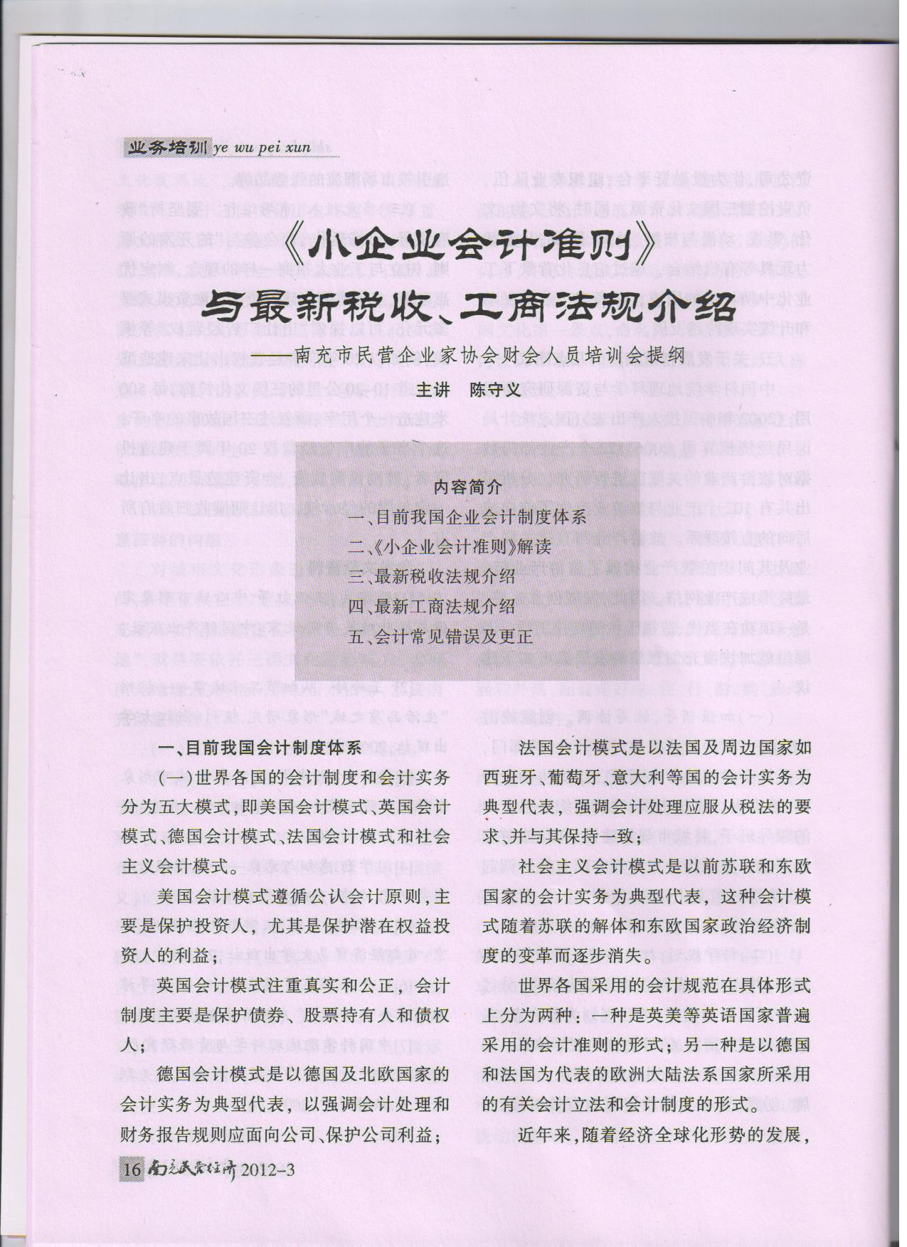 本所主任会计师、中国注册会计师、高级会计师陈守义应邀于2012531日在市民营企业家协会举办的财会人员培训会上作了精彩讲座,题目是《<小企业会计准则>暨新税收工商法规》,讲稿内容刊登在《南充市民营企业家协会会刊》2012年第三期。陈守义所长就目前我国企业会计制度体系、《小企业会计准则》解读、最新税收法规介绍、最新工商法规介绍和会计常见错误及更正等五个方面进行了深入讲解。参训人员纷纷表示:这次讲座立足企业发展,符合企业需求,大家学到了新法规,拓展了新视野,提升了实践能力,深感受益匪浅。