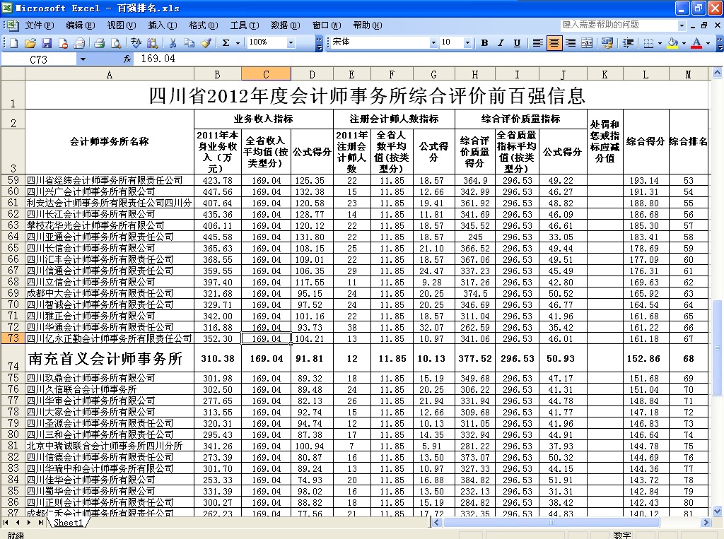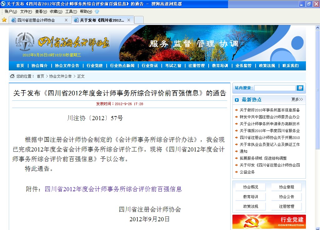 2012年,我所再次跻身四川省会计师事务所综合评价百强所,排名第68位,较2011年上升了16个名次。