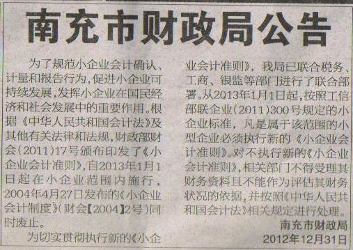 南充市财政局2012年12月31日在南充晚报发布公告。要求所有小企业从2013年1月1日起执行财政部颁布的《小企业会计准则》,违者将进行处理。为了帮助企业执行《小企业会计准则》,我所秉承为客户服务的宗旨,决定在近期免费为客户财会人员进行培训,由所长,高级会计师、中国注册会计师陈守义主讲,现将有关事项通知如下: