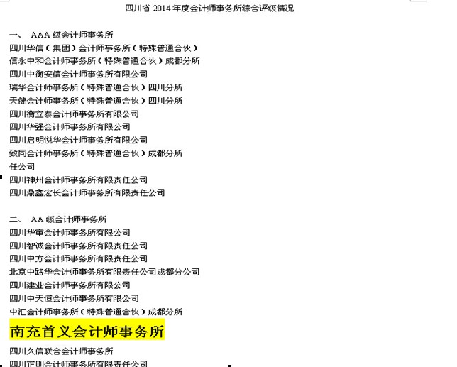热烈祝贺我所连续两年被评为四川省会计师事务所综合评级“AA”级会计师事务所,是南充唯一一家获此殊荣的会计师事务所。