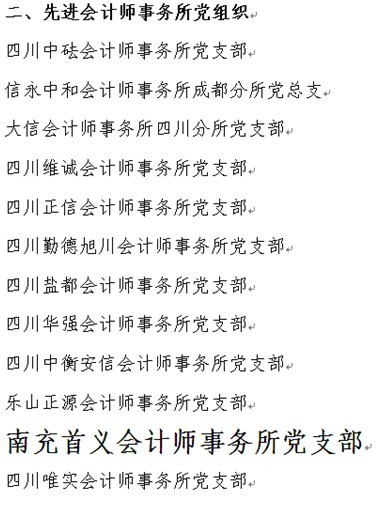 2014年10月13日,四川省注册会计师协会网站发布了《中共四川省注册会计师行业委员会关于表扬我省注册会计师行业2012-2014年度先进基层党组织和优秀个人的决定》(川会行党〔2014〕5号),对全省19家会计师事务所党支部予以表彰。我所名列其中,是南充地区唯一获此殊荣的会计师事务所。今后,我们一定要振奋精神,开拓创新,在深入推进行业党建工作中积极进取,再创佳绩。