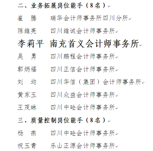 2014年10月26日四川省注册会计师协会发布了《关于表彰我省注册会计师行业2014年度审计工作等六大类岗位能手的通知》(川注协〔2014〕102号),评选出我省注册会计师行业2014年度审计、业务拓展等六大类岗位能手49名。我所所长助理、业务二部主任、注册资产评估师、注册税务师李莉平,经省注协专家评审组对面试情况和参评材料等进行评议后,最终在20多位参评选手中脱颖而出,被评为“四川省注册会计师行业2014年度业务拓展岗位能手”。
