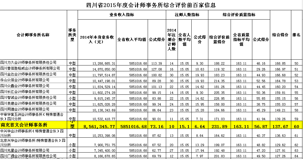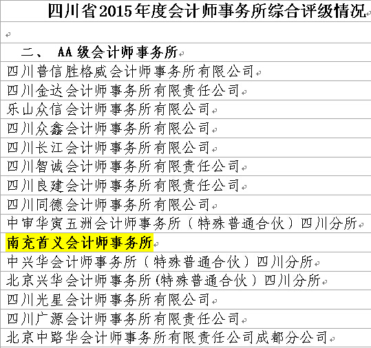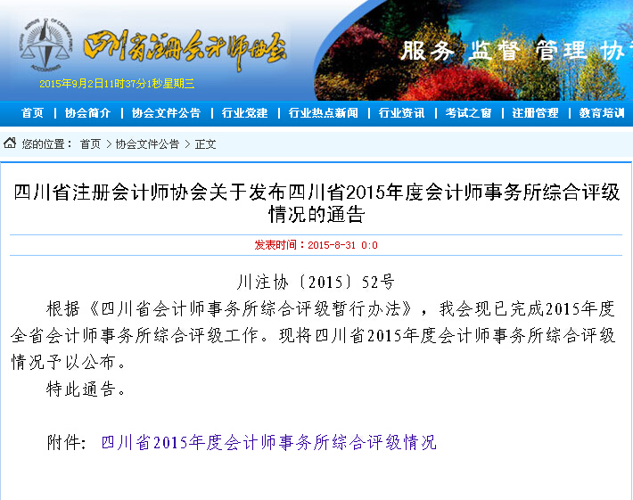 2015年8月26日,四川省注册会计师协会网站分别发布了《四川省注册会计师协会关于发布四川省2015年度会计师事务所综合评价前百家信息的通告》(川注协〔2015〕49号)和《四川省注册会计师协会关于发布四川省2015年度会计师事务所综合评级情况的通告》(川注协〔2015〕52号)的通告文件。