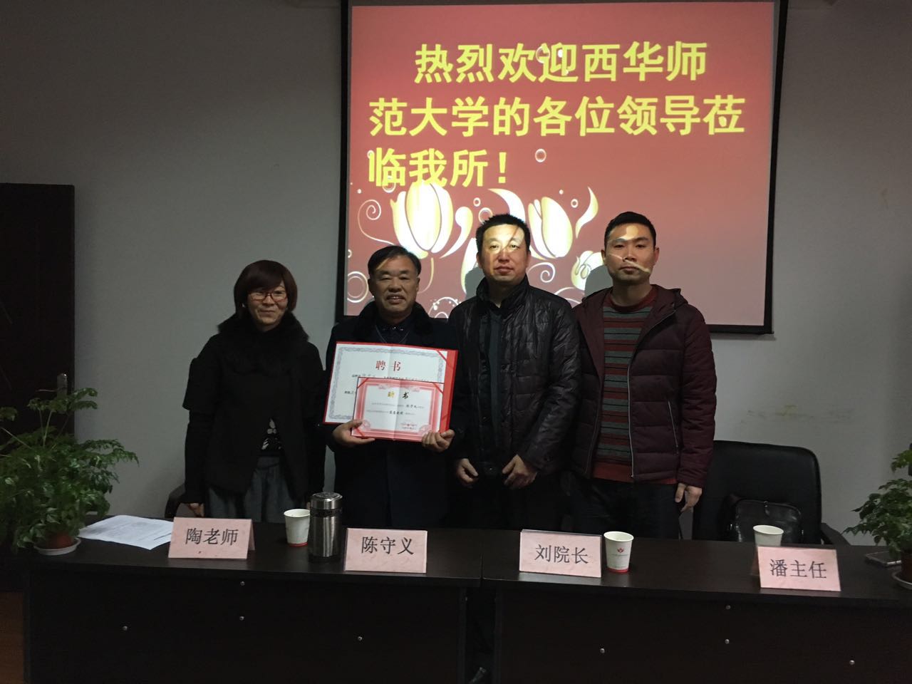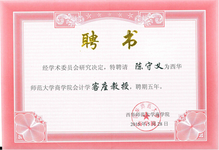 2016年12月9日上午9点,西华师范大学为陈守义所长颁发商学院会计学专业客座教授、外聘教师证书仪式在事务所培训部隆重举行。事务所所长陈守义、学院院长刘丁豪、财务金融系主任陶月英、财务金融系副主任潘林出席仪式并作重要讲话。聘任仪式由办公室主任沈艳主持。