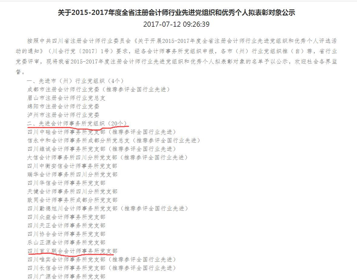 2017年7月12日,四川省注册会计师协会网站发布了《关于2015-2017年度全省注册会计师行业先进党组织和优秀个人拟表彰对象公示》,对全省20家会计师事务所党支部予以表彰。我所名列其中,是南充地区唯一一家连续六年获此殊荣的会计师事务所。今后,我们一定要振奋精神,开拓创新,在深入推进行业党建工作中积极进取,再创佳绩。
