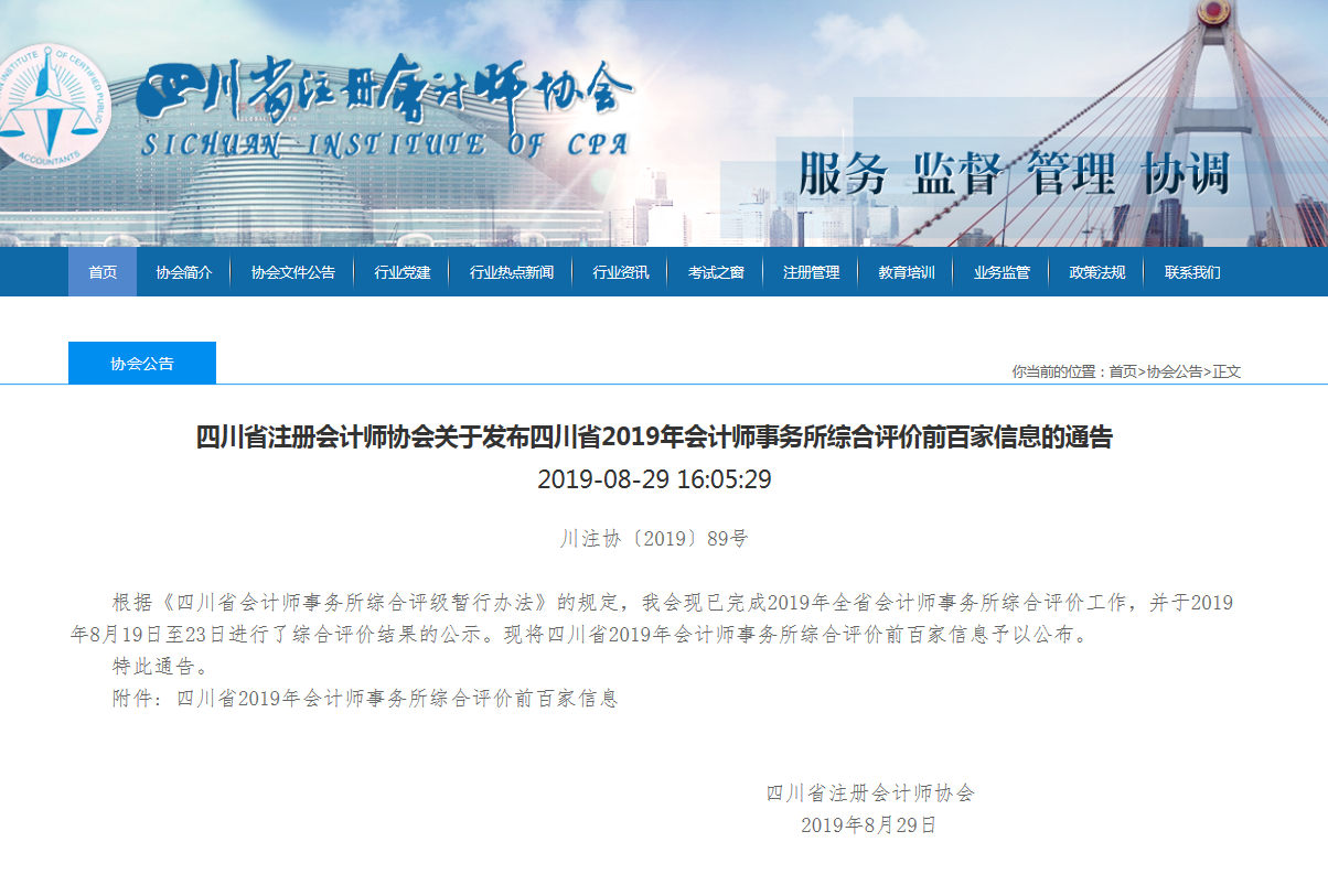 2019年8月29日,四川省注册会计师协会网站发布了《四川省注册会计师协会关于发布四川省2019年会计师事务所综合评价前百家信息的通告》(川注协〔2019〕89号)文件。