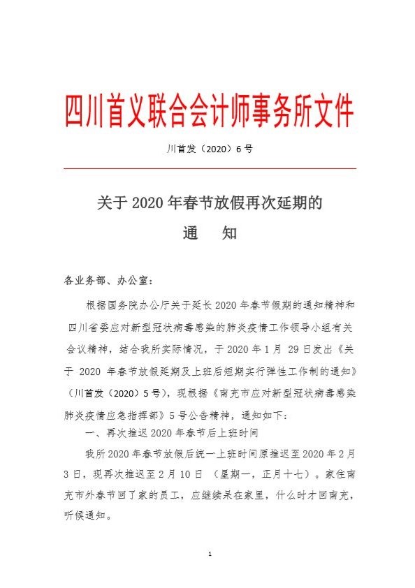 2月1日,我所根据疫情情况继续发布了《关于2020年春节放假再次延期的通知》(川首发[2020]6号)。